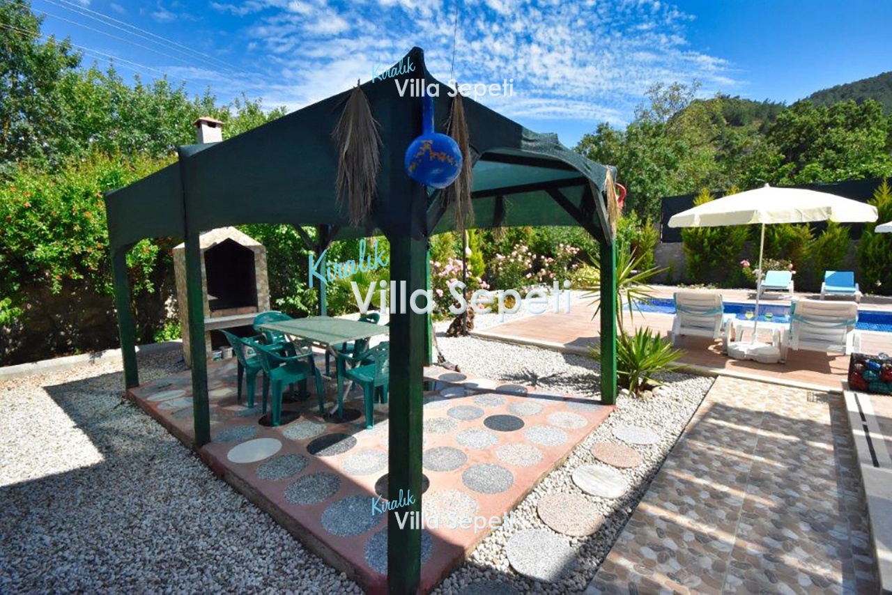 Şezlonglar, güneş şemsiyesi, salıncak, masa ve sandalyeler, barbekü, bulunur.