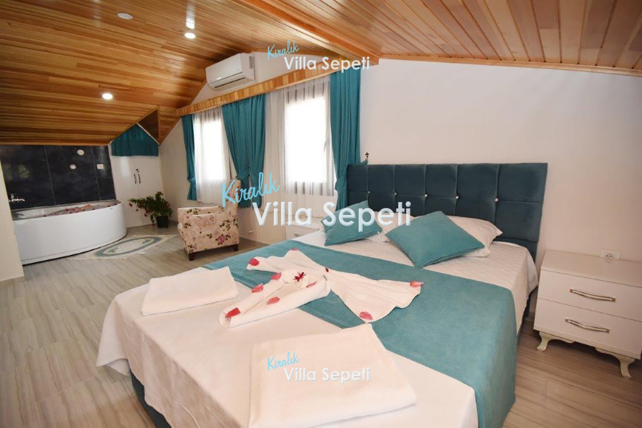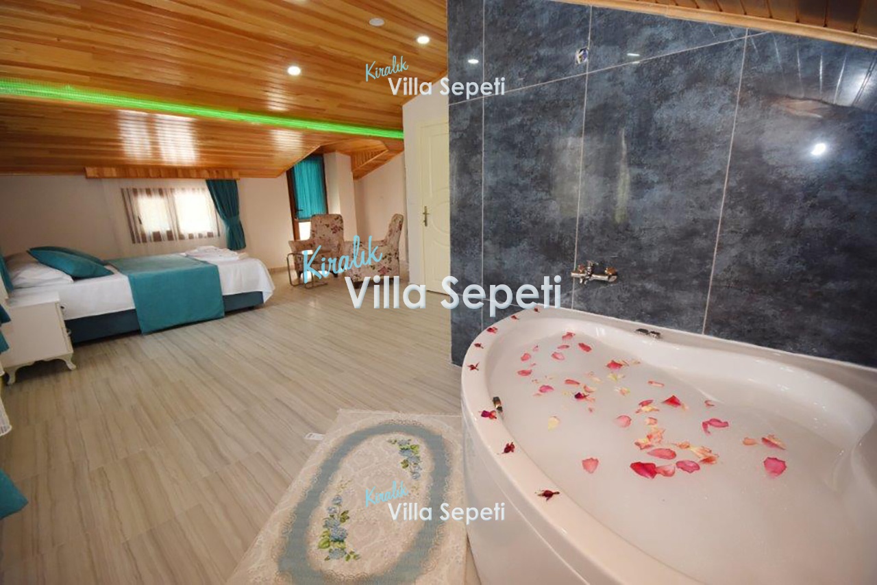 1. Yatak Odası: 1 adet çift kişilik yatak, elbise dolabı, klima, jakuzi, banyo ve tuvalet bulunur.