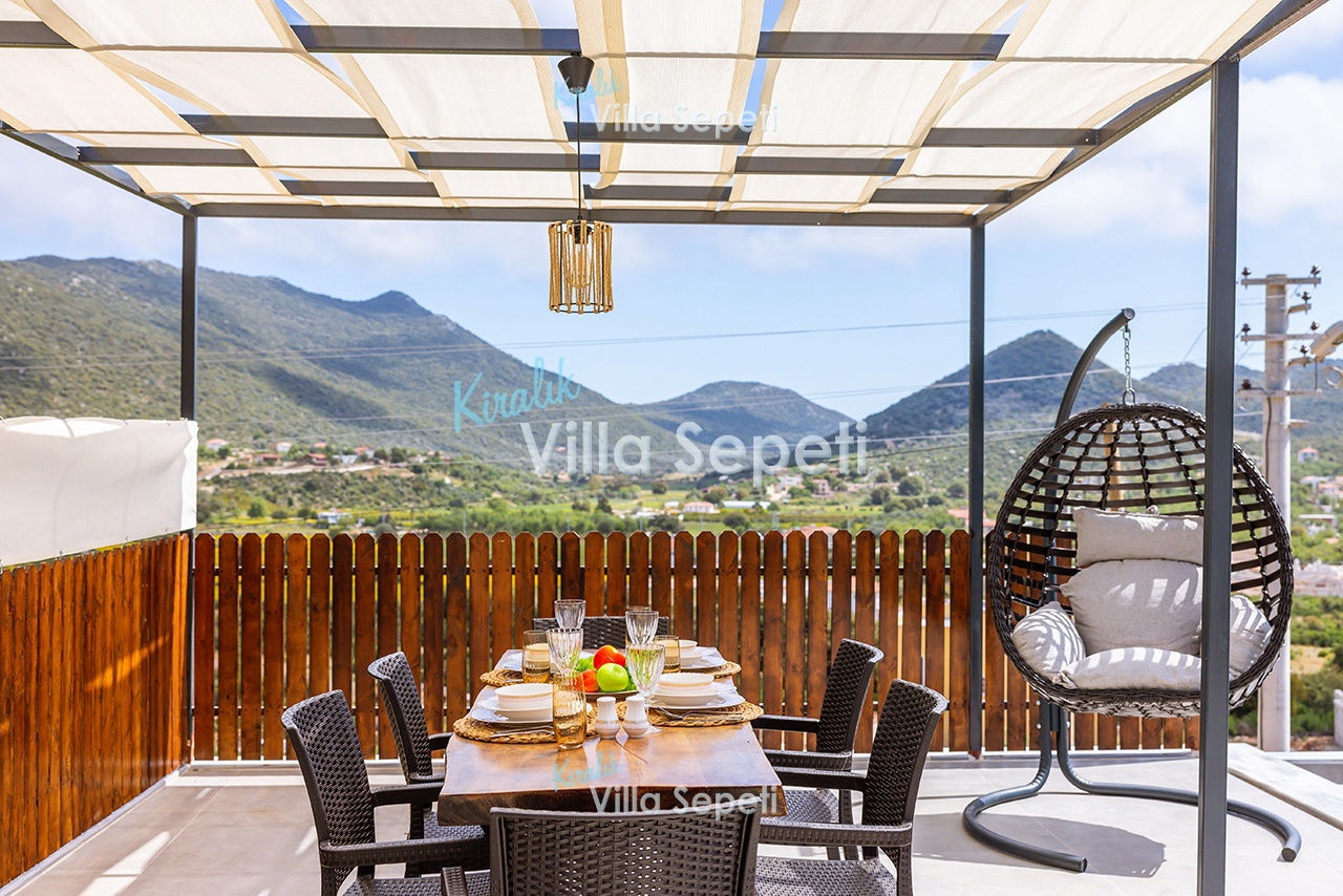 Şezlong, barbekü, damla salıncak, bahçe oturma grubu, bahçe masası ve sandalyeleri bulunur.