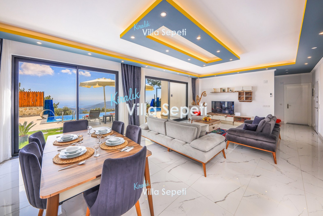 Doğa manzaralı rahat oturma grubu, orta sehpa, uydu alıcı, televizyon, klima, havuz terasına çıkış bulunur.