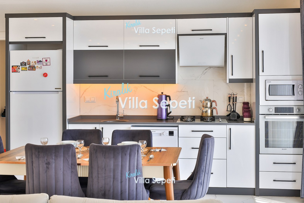 Modern Amerikan mutfak, buzdolabı, bulaşık makinesi, çamaşır makinesi, ankastre fırın, ankastre ocak, elektrikli su ısıtıcısı (ketıl), yemek takımı, tava, tencereler, çatal, bıçak vs. bulunur.