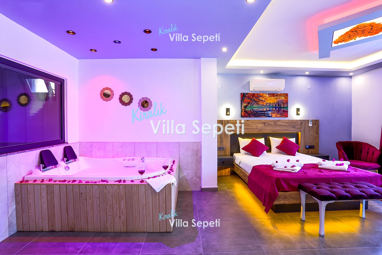 1. Yatak Odası: Suit odadır. 1 adet çift kişilik yatak, komodin, elbise dolabı, klima, makyaj masası, jakuzi, banyo&Wc bulunur.