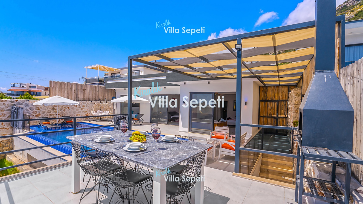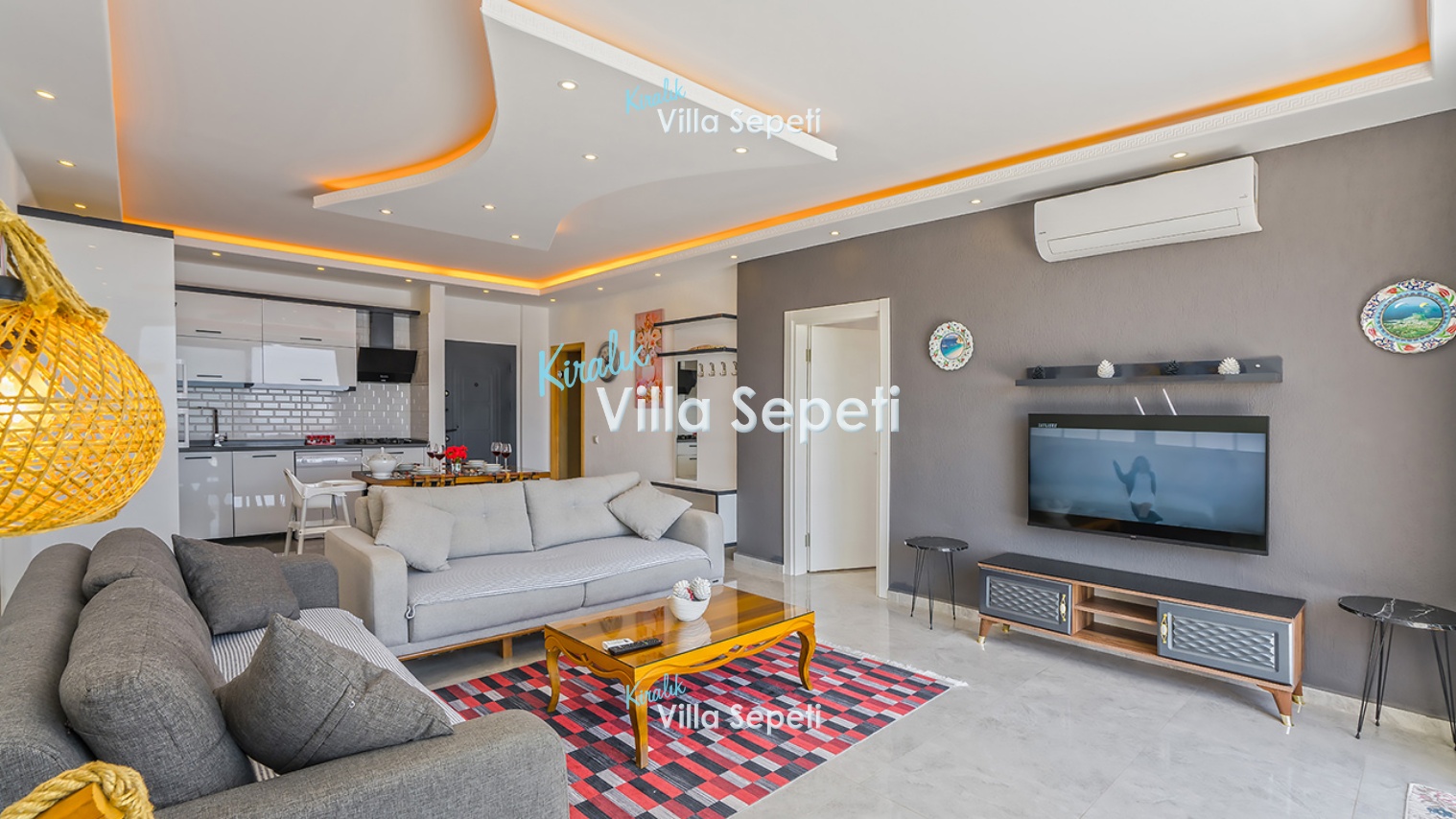 Modern oturma grubu, orta sehpa, TV, klima, uydu alıcı, Wifi, havuz terasına çıkış bulunur.