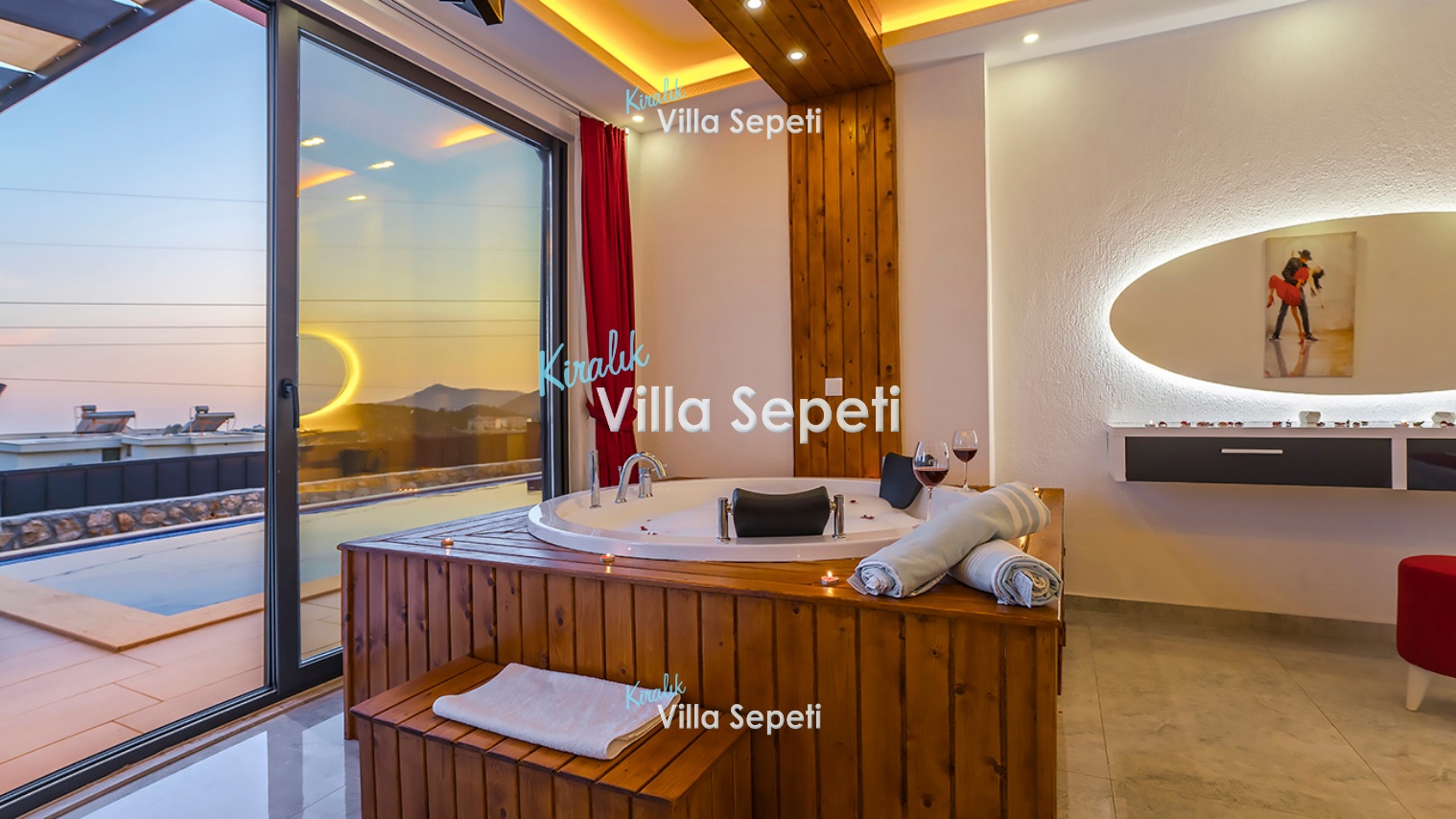 1. Yatak Odası: 1 adet çift kişilik yatak, komodin, elbise dolabı, makyaj masası, klima, Tv, jakuzi, havuz terasına çıkış bulunur.
